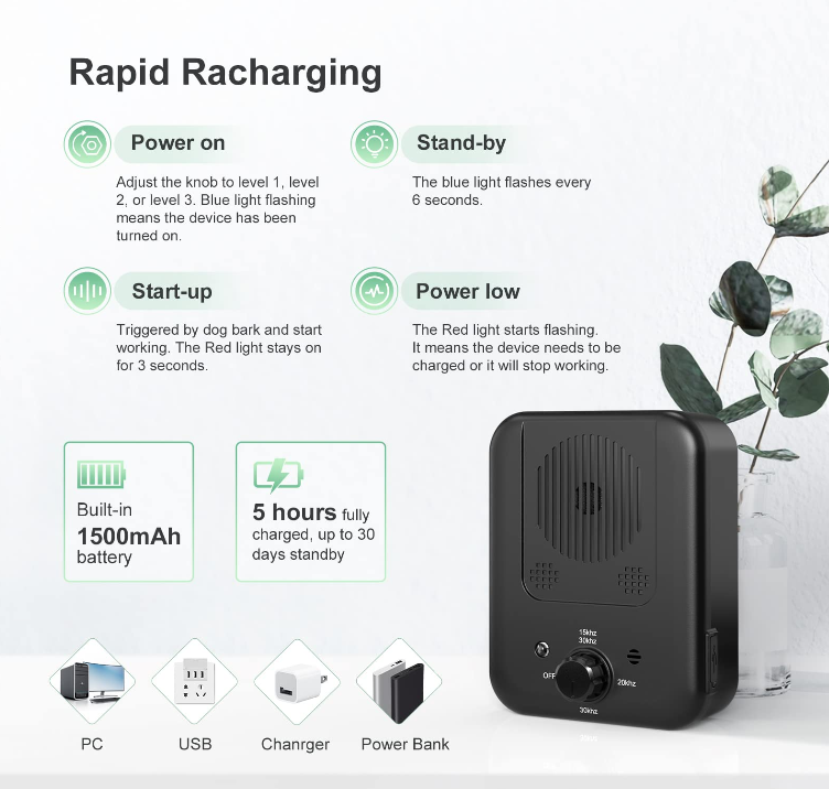 it uses only ultrasonic sound to train behavior. - Portable and Rechargeable: Compact design with USB charging,